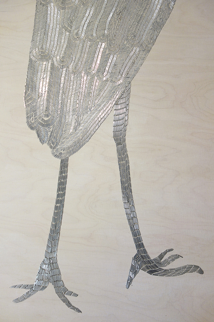 <em>Trophy II</em>. 2013.<br />Metal staples on birch wood, 120 x 150 cm.<br />Private collection.<br />